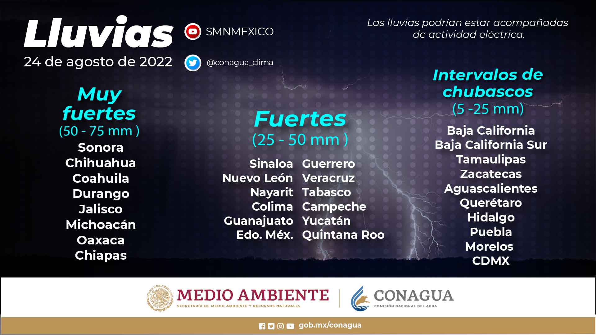 Se pronostican lluvias puntuales intensas (de 75 a 150 milímetros ) en Chihuahua, Chiapas, Durango, Jalisco, Nayarit, Oaxaca, Sinaloa y Sonora; muy fuertes (de 50 a 75 mm) en sitios